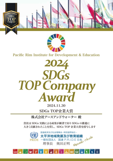 昨年末、株式会社アースアンドウォーターは 「2024 SDGs TOP Company Award SDGs(TOP企業大賞)」 を受賞いたしました。