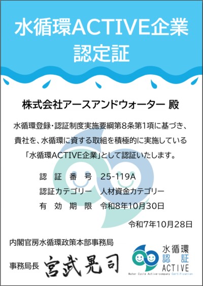 「水循環ACTIVE企業」として認定されました。